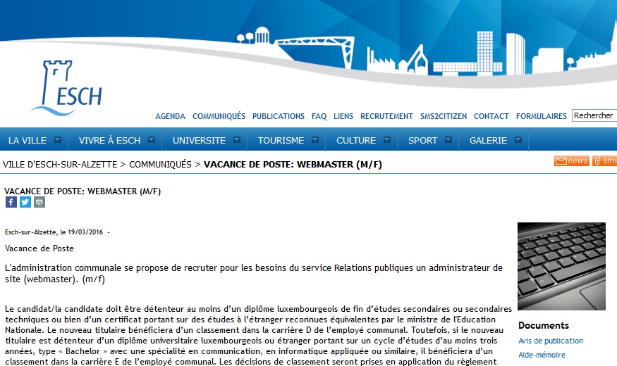 A admnistração comunal de Esch/Alzette pretende contratar um webamster para o seu site oficial.