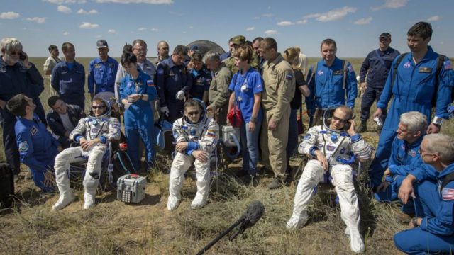 Três astronautas aterraram hoje sem incidentes nas estepes do Cazaquistão após terem passado seis meses a bordo da Estação Espacial Internacional (EEI).