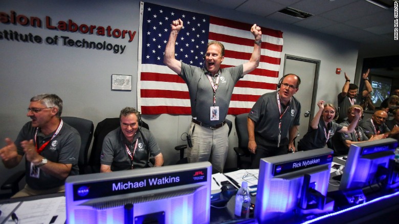 “Bem-vindos a Júpiter!” brilhou nos ecrãs do controlo da missão no Jet Propulsion Lab da NASA em Pasadena, Califórnia. A equipa de Juno aplaudiu e abraçou-se.