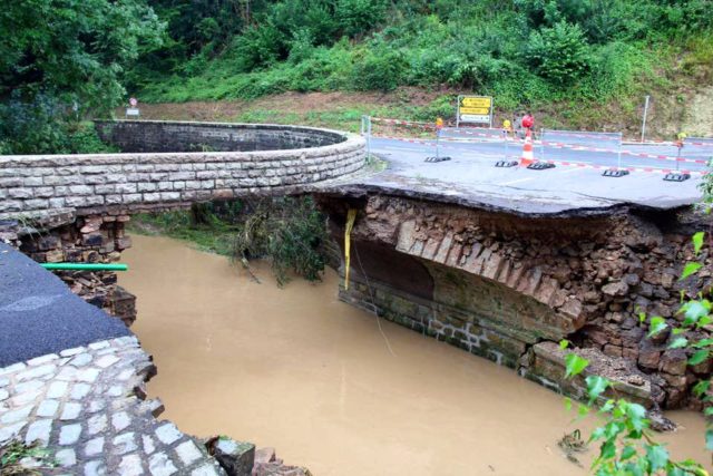 O forte temporal que se abateu na passada sexta-noite à noite fez com que as águas da chuva provocassem o desabamento de uma ponte da estrada nacional que ligava Bettendorf a Eppeldorf.
