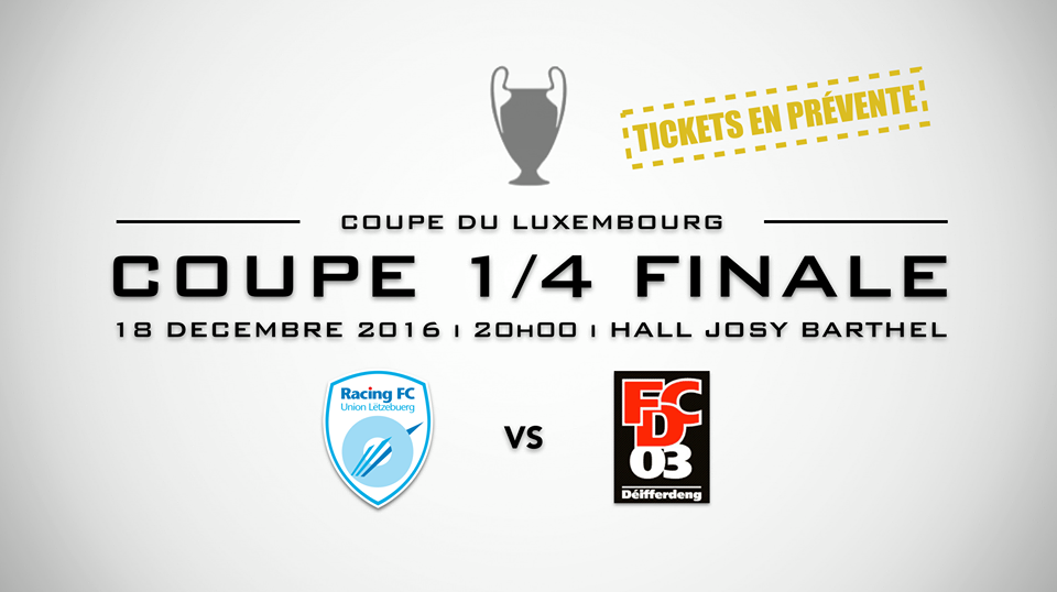 Este domingo 18 de Dezembro pelas 20h00 no pavilhão do Estádio Josy Barthel, os amantes do Futsal têm boas razões para sorrir. O sorteio dos quartos-de-final da taça ditou um Racing – Differdange, duas formações que já provaram ser a Elite do Futsal luxemburguês. De um lado, o Racing ainda não perdeu um único jogo (na liga 2), do outro o Differdange apenas perdeu um contra o Samba Seven.