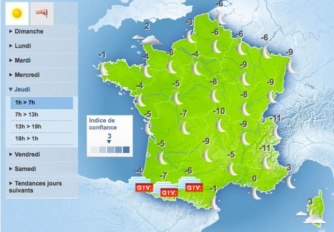 As temperaturas irão diminuir gradualmente durante o fim de semana para descer abaixo dos 0°C a partir de terça-feira, de acordo com a Météo France. Esperam-se fortes geadas. “Muitas regiões, exceto o Atlântico e zonas costeiras do Mediterrâneo vão ter dias de gelo a partir de terça-feira“,advertem os meteorologistas.