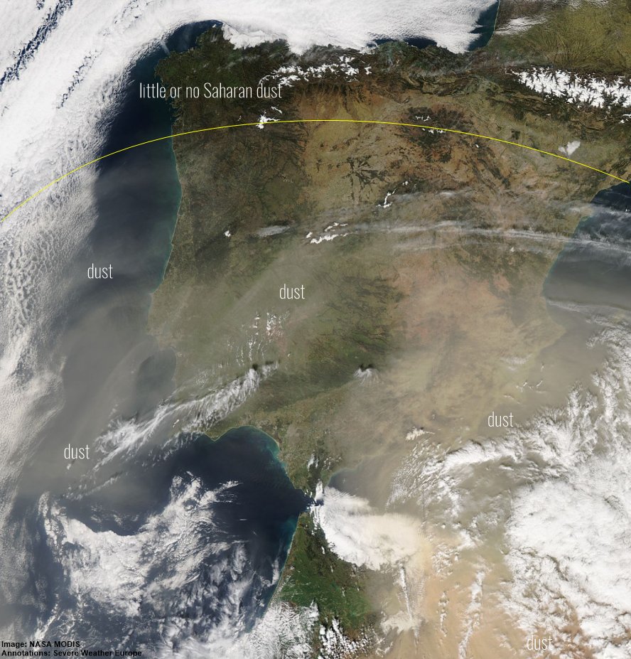 A NASA revelou esta quinta-feira, através do seu Twitter oficial, que uma grande parte da Península Ibérica está a ser afetada por uma mancha de poeira arrastada pelo vento desde o deserto do Saara, no norte de África.