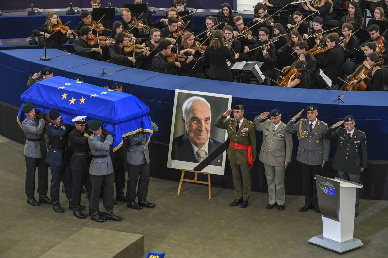 O caixão, coberto com a bandeira europeia e transportado por oito militares alemães, foi colocado no centro do hemiciclo para a cerimónia, sem precedente na história da União Europeia (UE).