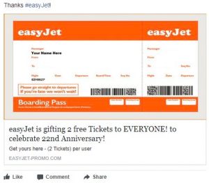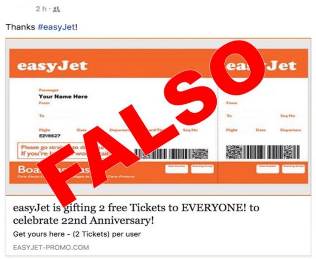 Recentemente surgiram publicações de uma oferta de 2 bilhetes de avião da easyJet, como forma de comemorar os 22 anos de existência da companhia aérea… mas é uma oferta falsa.