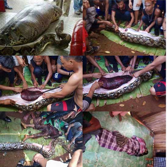 Em março de 2017, um homem indonésio foi encontrado morto na barriga de uma píton de sete metros que o havia engolido por completo perto de uma plantação de dendezeiros na aldeia de Salubiro, na ilha de Sulawesi.