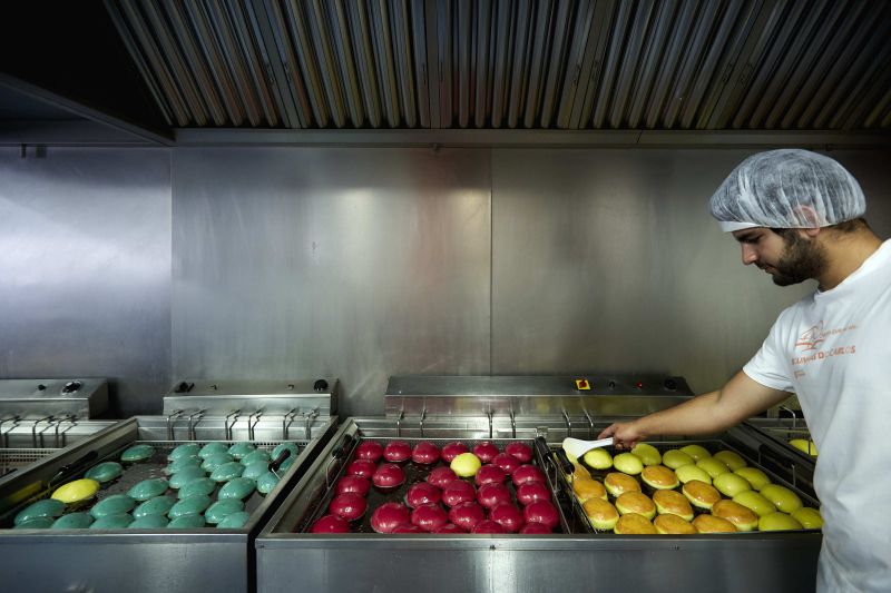 Antes de irem para a fritadeira, saltam à vista as cores vivas das bolas feitas à base de spirulina, que têm um tom azulado, e de beterraba, de cor vermelha, mas depois de fritas ganham todas uma cor acastanhada e é a cor interior da massa que as denuncia.