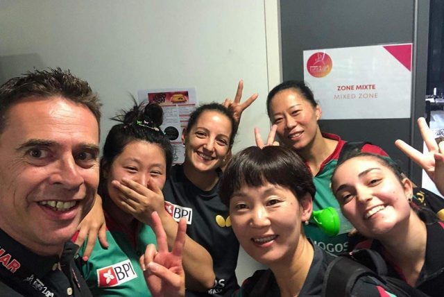 A equipa lusa, atual 26.ª do ‘ranking’ europeu, chegou rapidamente aos 2-0, através de Fu Yu, que derrotou Dora Madarasz por 3-0 (11-9, 11-5 e 11-9) e de Jieni Shao, que bateu Georgina Pota por 3-1 (11-7, 7-11, m11-9 e 11-9).