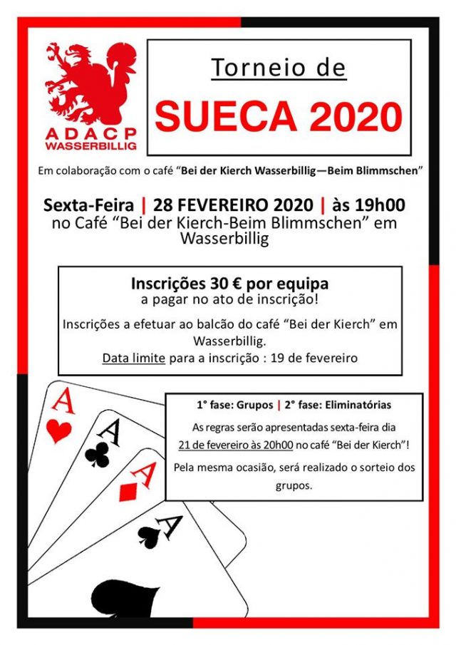 Início Associações Wasserbillig: Torneio de Sueca da ADACP Associações Wasserbillig: Torneio de Sueca da ADACP Por jdLux - 20/01/2020 144 0 A ADACP em colaboração com o café “Bei der Kierch- Beim Blimmschen” está a organizar um torneio de sueca. O torneio está agendado para o dia 28 de fevereiro e as inscrições custam 30 euros e deverão ser feitas até ao dia 19 de fevereiro. Publicidade