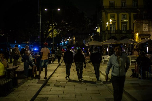 O comércio fechou todo logo às 19. Os restaurantes podiam ficar até às 23. Mas já mais de meia hora depois disso, nos Guindais, Maria senta-se nas escadas com umas poucas dezenas de pessoas. “Tínhamos de sair de casa”, confessa. “É triste ver isto assim. Normalmente não se pode andar aqui”, vai comparando, a pensar noutros anos.