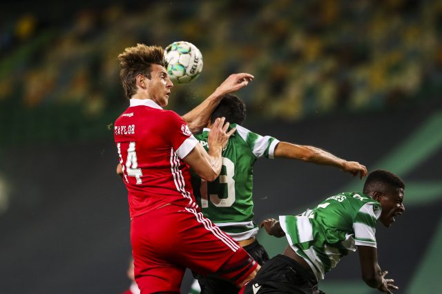 Início Futebol Liga Europa LE: Sporting CP - Aberdeen (1-0 ao intervalo) AtualidadeDesportoFutebolLiga Europa LE: Sporting CP - Aberdeen (1-0 ao intervalo) Por jdLux - 24/09/2020, 21:56 40 0 Sporting player Luis Neto (C) vies for the ball with Aberdeen player Ashton Taylor (L) during their UEFA Europa League third qualifying round match, at Jose Alvalade Stadium, Lisbon, Portugal, 24 September 2020. JOSE SENA GOULAO/LUSA Publicidade