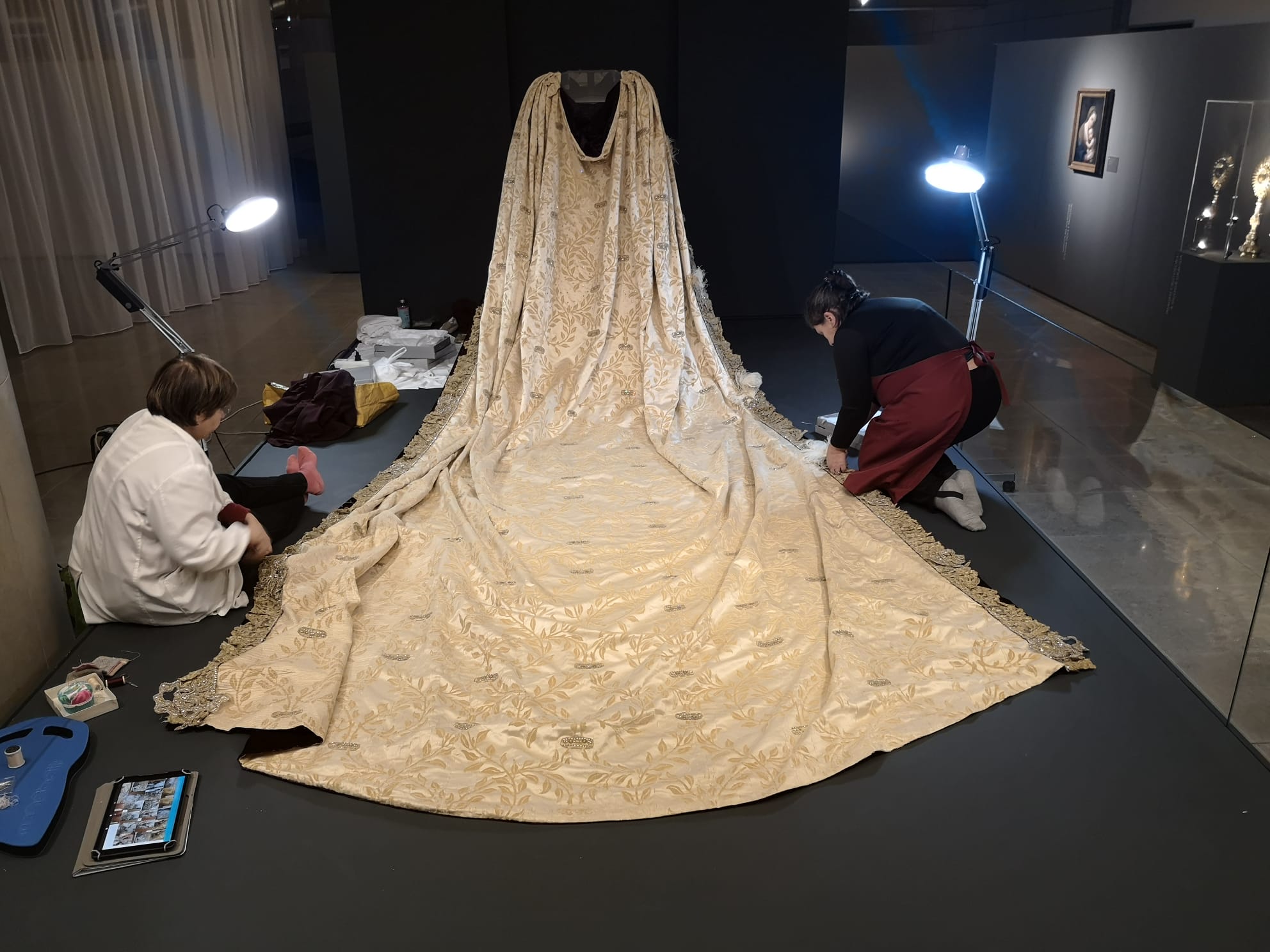 “A intervenção, que teve a duração de oito meses, consistiu na desmontagem das várias partes constituintes da peça, na limpeza de sujidades por via mecânica, na planificação do tecido através de humidificação controlada, na fixação da pedraria em destacamento e na montagem da peça, entre outras intervenções consideradas pertinentes”, de acordo com o gabinete de comunicação do Santuário de Fátima.