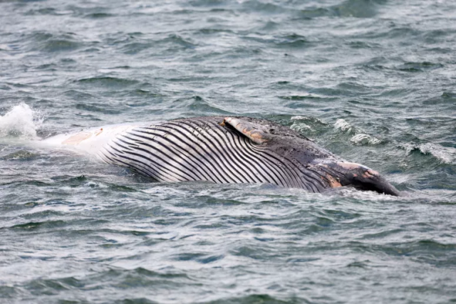 As causas da morte desta baleia comum do sexo masculino, que apresentava ferimentos, vão ser apuradas por duas biólogas do Centro de Recuperação de Animais, em Ílhavo.