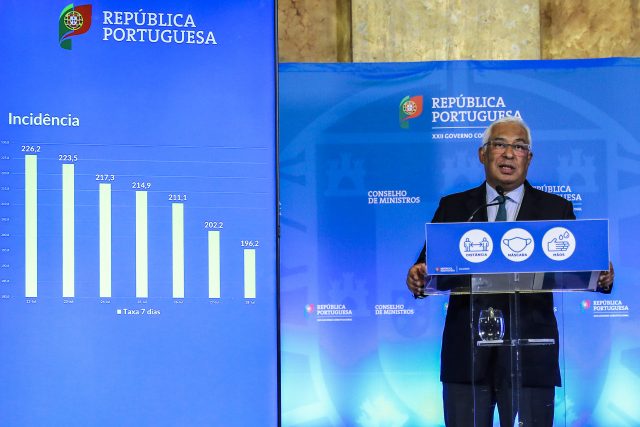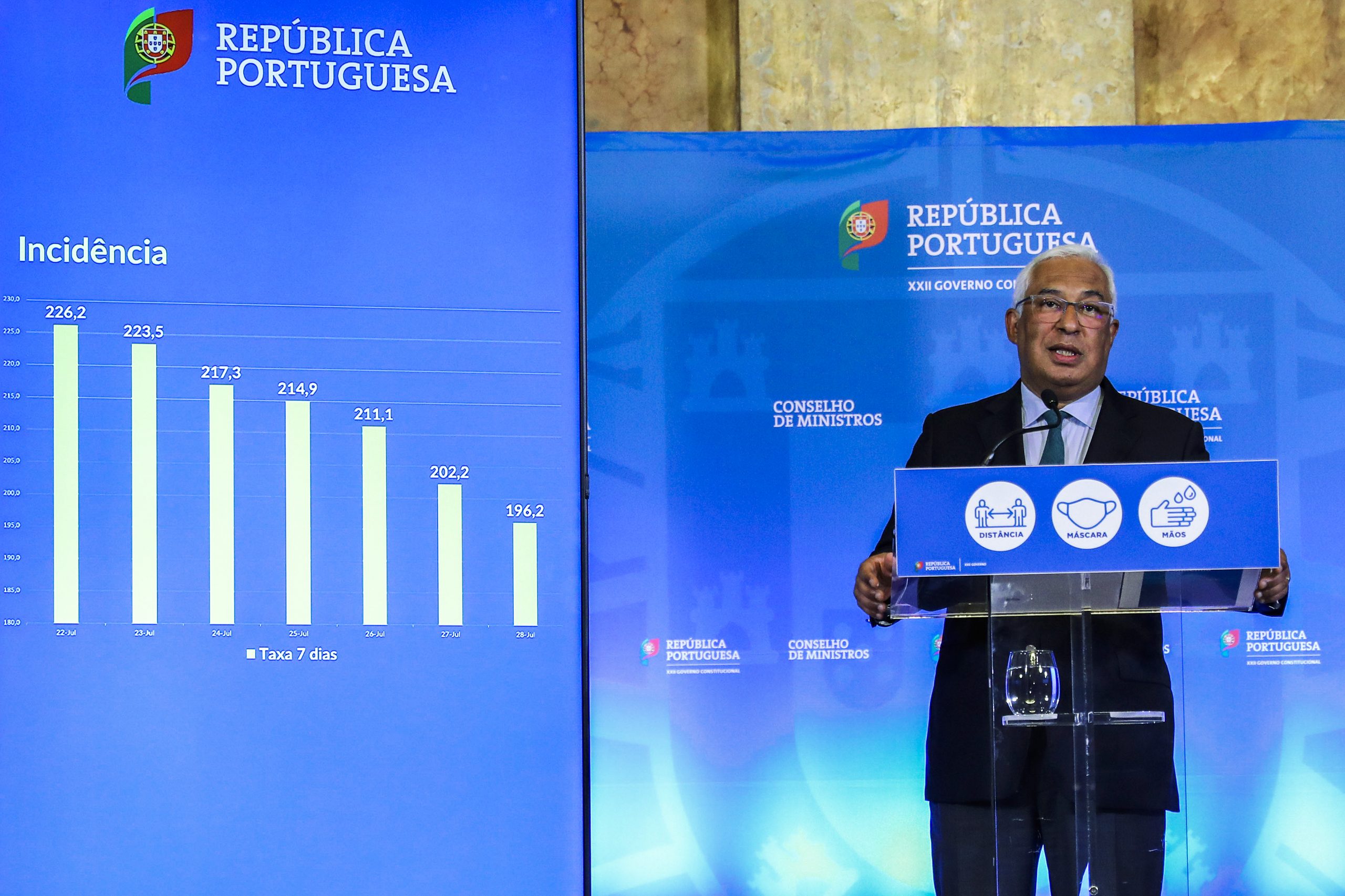 O primeiro-ministro, António Costa, intervém durante a conferência de imprensa no final da reunião do Conselho de Ministros, que se reuniu hoje para decidir os próximos passos no processo de abertura do país, dois dias depois de especialistas terem sugerido a evolução das medidas de restrição de acordo com a taxa de vacinação contra a covid-19, no Palácio da Ajuda, em Lisboa, 29 de julho de 2021. MIGUEL A. LOPES/LUSA