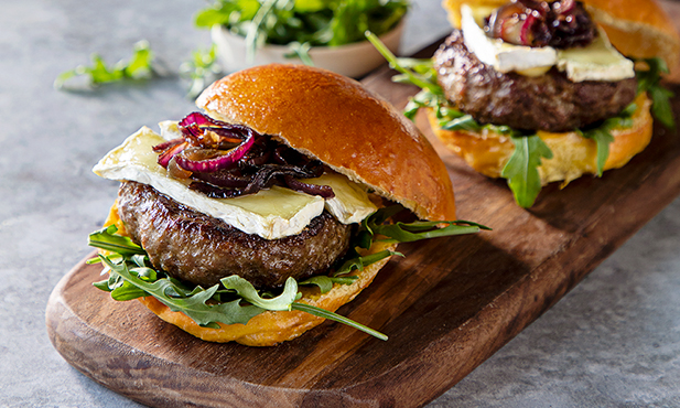 Retire os hambúrgueres do forno, coloque por cima as fatias de brie e volte a pôr no forno para que o queijo derreta.