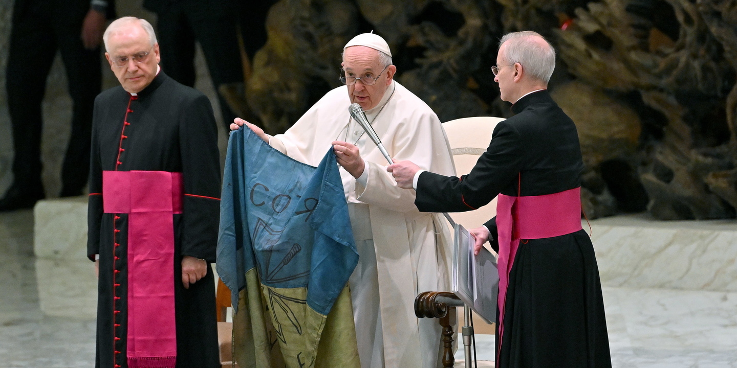 O Papa Francisco apresentou, no Auditório Paulo VI, no Vaticano, uma bandeira da Ucrânia que chegou de Bucha. Segurou-a durante alguns momentos e foram ouvidos aplausos na sala. Antes de a devolver, beijou-a.