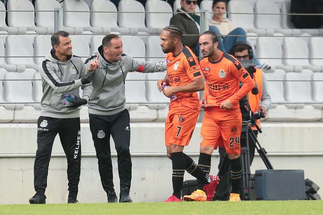 O jogador do Boavista Gorré (D) festeja com o treinador Petit (E) o golo obtido contra o Moreirense durante o jogo da 32ª jornada da I Liga de futebol realizado no Estádio Parque Desportivo Comendador Joaquim de Almeida Freitas, Moreira de Cónegos, 1 Maio 2022, MANUEL FERNANDO ARAUJO/LUSA