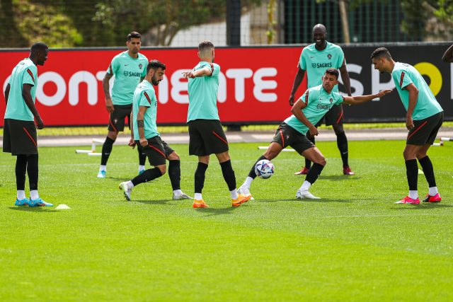 Portugal soccer team players (L-R) William Carvalho, Joao Cancelo, Bruno Fernandes, Domingos Duarte, Matheus Pereira, Danilo Pereira and David Carmo, during the training session at Cidade do Futebol in Oeiras, outskirts of Lisbon, Portugal, 01 June 2022. Portugal will play against Spain, Czech Republic and Switzerland for the upcoming UEFA Nations League. JOSÉ SENA GOULÃO/LUSA