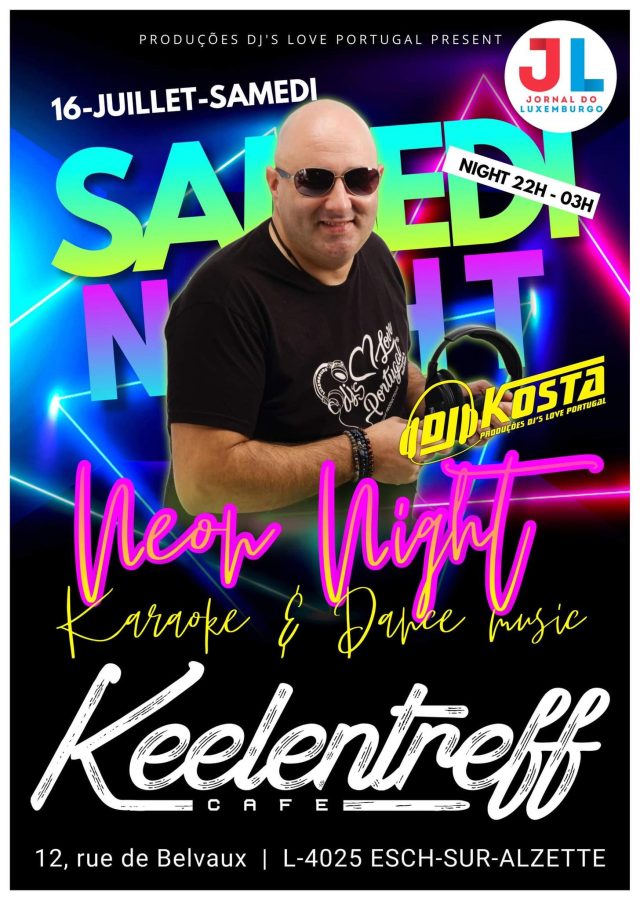 Início Culturas Animação ESCH/ALZETTE: “Neon night” com DJ Kosta Miguel no Keelentreff CulturasAnimaçãoAtualidade ESCH/ALZETTE: “Neon night” com DJ Kosta Miguel no Keelentreff Por jdLux - 16/07/2022, 18:42 97 0 A animação da noite deste sábado passa pelo Keelentreff café em Esch/Alzette. A “Neon night” começa por volta das 22:00 com o DJ Kosta Miguel e terminará às 3:00. Apareça! O Keelentreff café fica no 12, rue de Belvaux.Publicidade