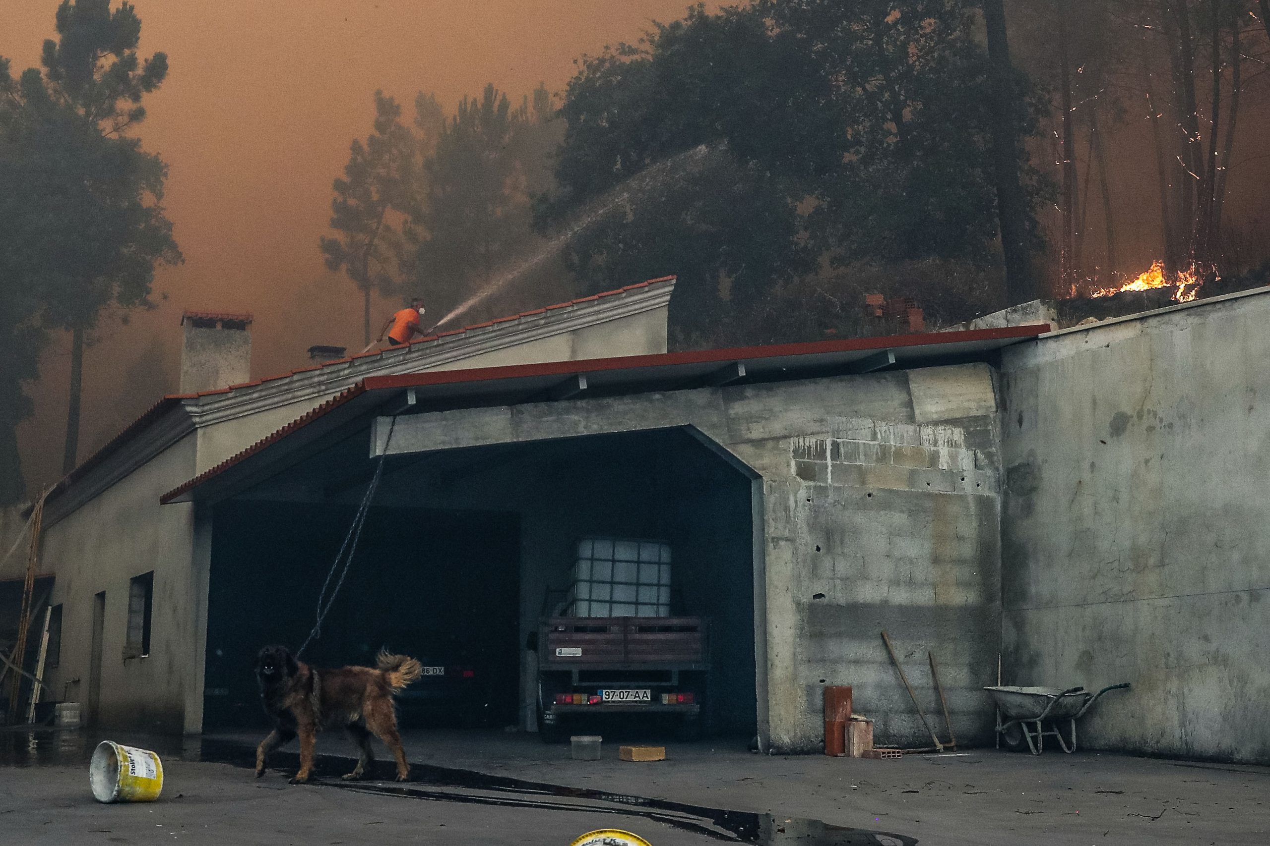 A man fights the flames surrounding his house in the village of Boavista, Ansião, during the fight against the fire that started in Abiul, Pombal, north of Portugal, July 13, 2022. PAULO NOVAIS/LUSA