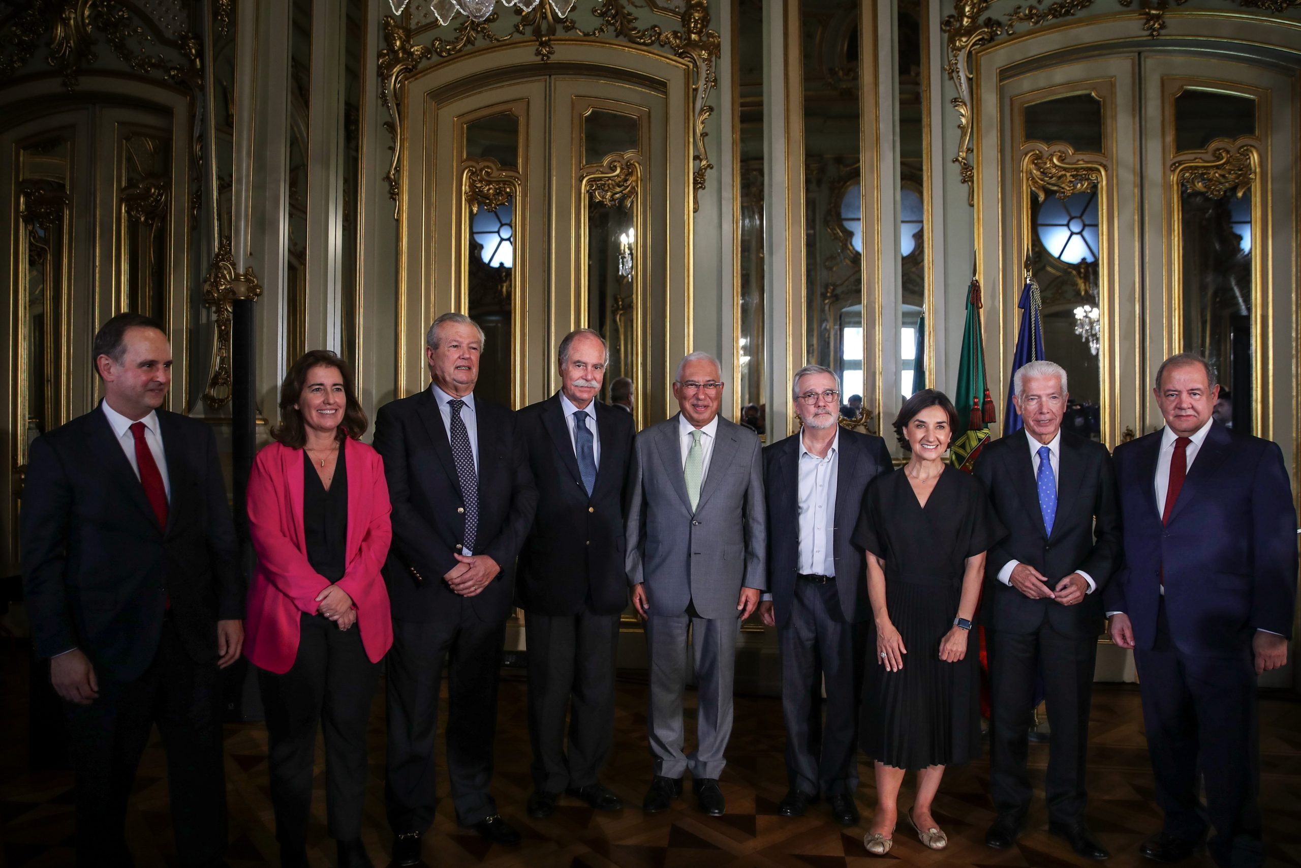 O primeiro-ministro, António Costa (C), acompanhado por vários ministros e representantes dos parceiros sociais, posa para a foto no final da cerimónia de assinatura do Acordo de Médio Prazo de Melhoria dos Rendimentos, dos Salários e da Competitividade, em Lisboa, 09 de outubro de 2022. ANTÓNIO COTRIM/LUSA