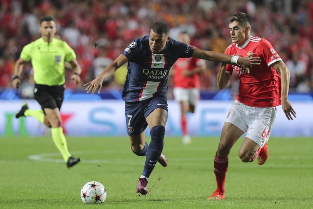 Início Futebol Liga dos Campeões LC: SL Benfica - PSG (1-1 ao intervalo) AtualidadeDesportoFutebolLiga dos Campeões LC: SL Benfica - PSG (1-1 ao intervalo) Por jdLux - 05/10/2022, 21:47 3 0 Benfica soccer player António Silva (R) in action with Paris Saint German soccer player Kylian Mbappé during the UEFA Champions League Group H match at Luz Stadium in Lisbon, Portugal, 5 of October 2022. MIGUEL A. LOPES/LUSA Publicidade