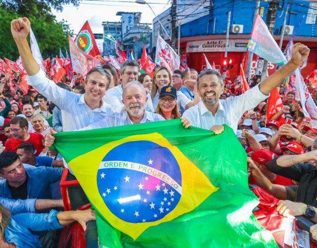 Os apoiantes do ex-presidente empunhavam bandeiras vermelhas com detalhes nas cores verde e amarelo, em conjunto com trabalhadores que promovem campanhas de candidatos de esquerda e suas bandeiras coloridas.
