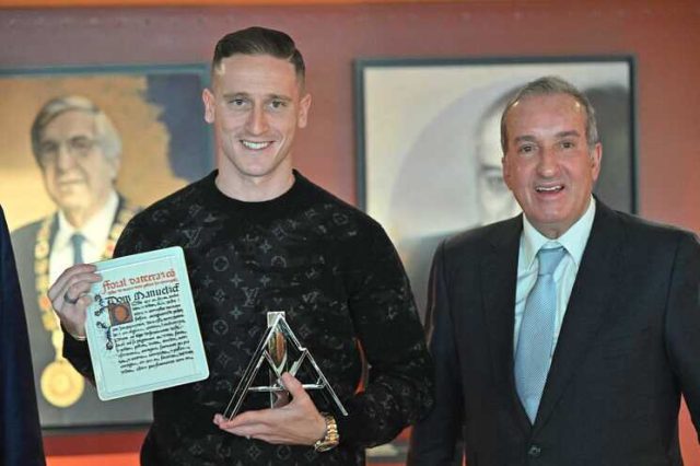 O avançado, que é natural da freguesia de S. Pedro de Avioso, recebeu a distinção nos Paços do Concelho, das mãos do presidente António Silva Tiago, que também prestou igual homenagem ao árbitro internacional de futsal Sérgio Soares, também ele natural do município.