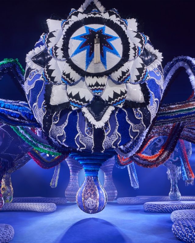 A partir de um centro azul, partem vários braços coloridos em todas a direções, com acabamentos em ‘crochet’ de lã, bordados de Viana do Castelo e pedrarias.