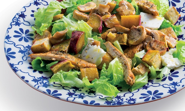 Numa tigela disponha a alface, as tiras de frango, a batata-doce assada, os cogumelos e o queijo de cabra laminado.