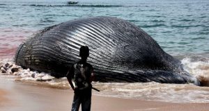 Baleia gigante encalha em praia da Beira no centro de Moçambique